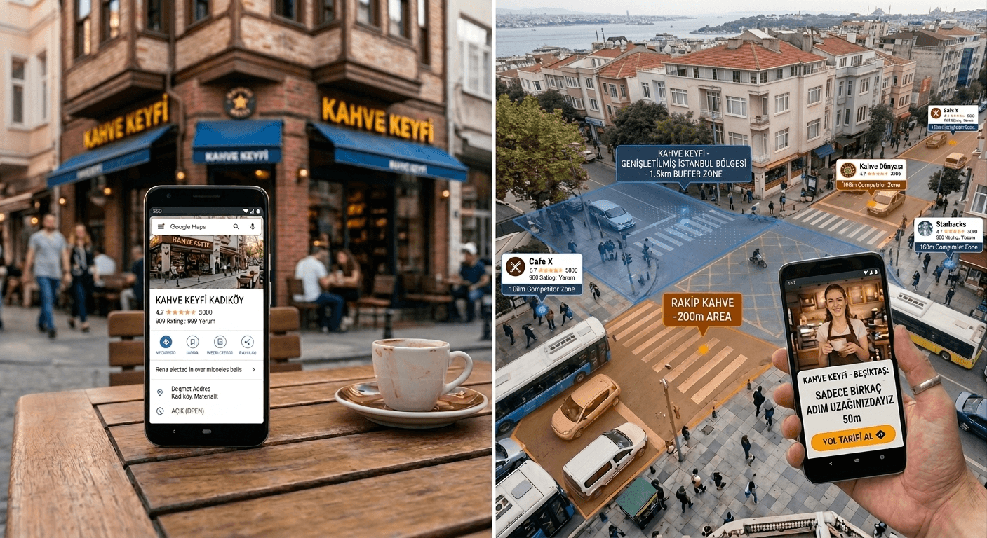 Targeting only the city of "Ankara" or the "Cankaya" district is too broad and costly. However, using GPS data to tell people within just a 500-meter radius of your store, "We're right on the back street, your dessert is on us with your coffee today!" maximizes conversion rates. Especially by targeting a 500-meter to 1 km radius around competitor stores, you can draw their customers to your own store with attractive offers.